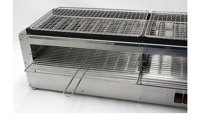 大量調理に向いている大型店舗用の炭火王です!三相200Vで動くため、安い電力を使用できます。串焼きはもちろん、網焼きも得意とし、更に上面焼きにも対応しています。